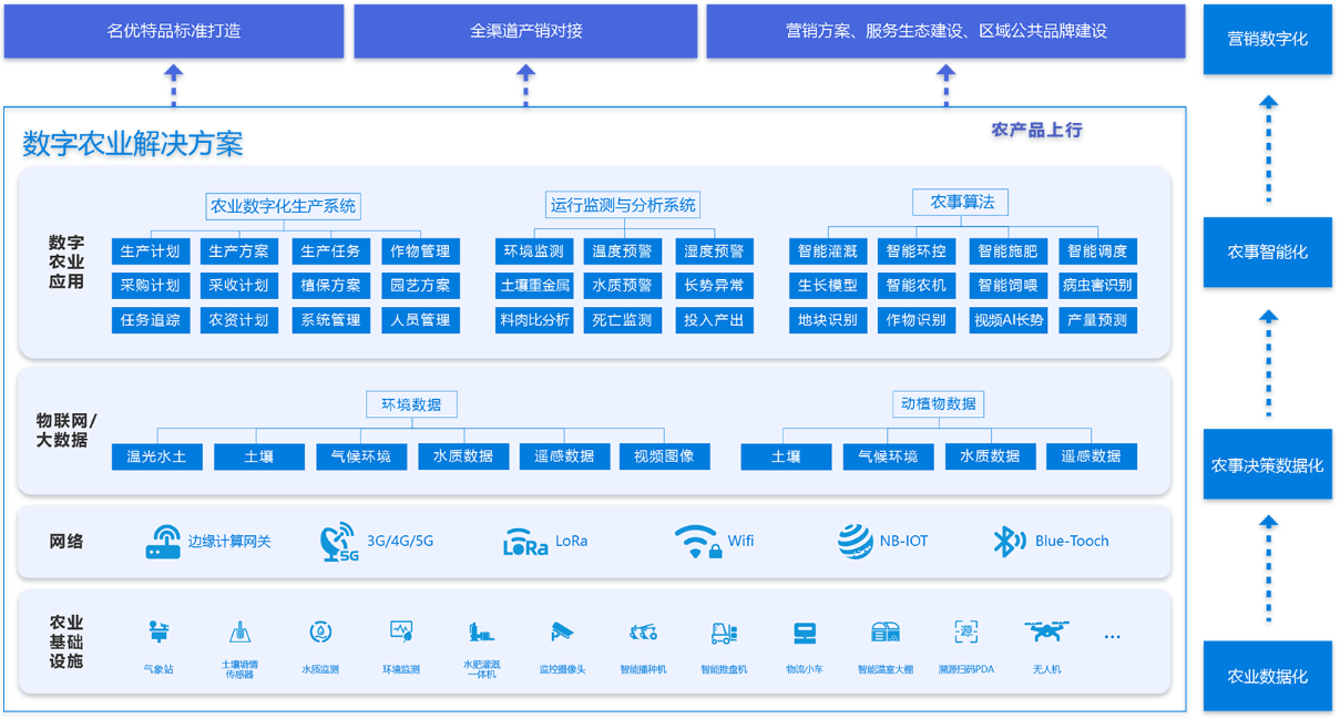 華維農(nóng)抬頭數(shù)字農(nóng)業(yè)信息平臺通過新一代物聯(lián)網(wǎng)、大數(shù)據(jù)、5S、 5G等信息化技術(shù)有效整合省市縣各級涉農(nóng)資源,以頂層設(shè)計方式建成“ 1+X+N數(shù)字藍圖 ”,即一套網(wǎng)、一張圖、一個中心、一個平臺、一個門 戶、X產(chǎn)業(yè)集群和N個應(yīng)用,匯聚農(nóng)業(yè)產(chǎn)業(yè)、農(nóng)業(yè)“兩區(qū)”、物聯(lián)網(wǎng)、植保、農(nóng)機、畜牧、農(nóng)資、農(nóng)經(jīng)、科 教等各級農(nóng)業(yè)業(yè)務(wù)應(yīng)用及數(shù)據(jù),形成“農(nóng)業(yè)農(nóng)村”數(shù)據(jù)中心。實現(xiàn)區(qū)域內(nèi)涉農(nóng)產(chǎn)業(yè)數(shù)據(jù)的整合、互通和共享, 構(gòu)建完備的涉農(nóng)基礎(chǔ)信息資源,激活數(shù)據(jù)應(yīng)用場景,勾勒出清晰的涉農(nóng)產(chǎn)業(yè)主體的畫像,摸清楚區(qū)域內(nèi)涉 農(nóng)“產(chǎn)業(yè)家底”,使得涉農(nóng)產(chǎn)業(yè)“生產(chǎn)得好、管理得好、服務(wù)得好、決策得好、賣得好”。