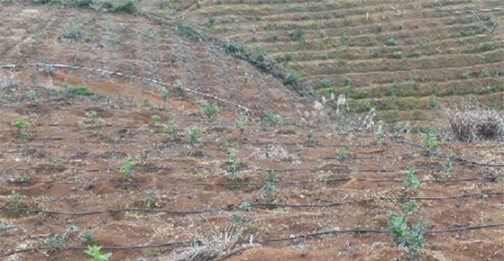 在油茶種植株行距為3*2.5米左右,沿等高線種植。對(duì)于株距較規(guī)整的園 區(qū),可采用HW1730(1.5L/H )壓力補(bǔ)償?shù)喂鄮?。HW1730(1.5L/H )滴 灌帶為內(nèi)鑲式壓力補(bǔ)償?shù)喂鄮?,滴頭與毛管一體成型,滴頭等間距(一般 50cm或100cm),現(xiàn)場(chǎng)安裝時(shí)沿種植行向地表鋪設(shè)即可,施工方便,省 去毛管打孔安裝管上式滴頭工序,具有抗旱性、造價(jià)低廉等優(yōu)勢(shì)。