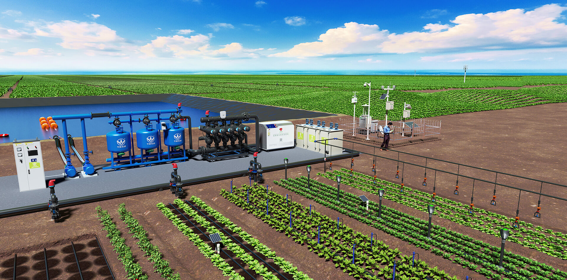 灌溉系統(tǒng)的首部樞紐包括純水處理系統(tǒng)、過濾設(shè)施、施肥設(shè)備、控制設(shè)備、安全保護及量測設(shè)施等部件。其作用是從水源取水加壓,并加入肥料或農(nóng)藥,經(jīng)凈化處理,擔(dān)負著整個灌溉系統(tǒng)的加壓、供水(肥、藥)、過濾、量測和調(diào)控的任務(wù)