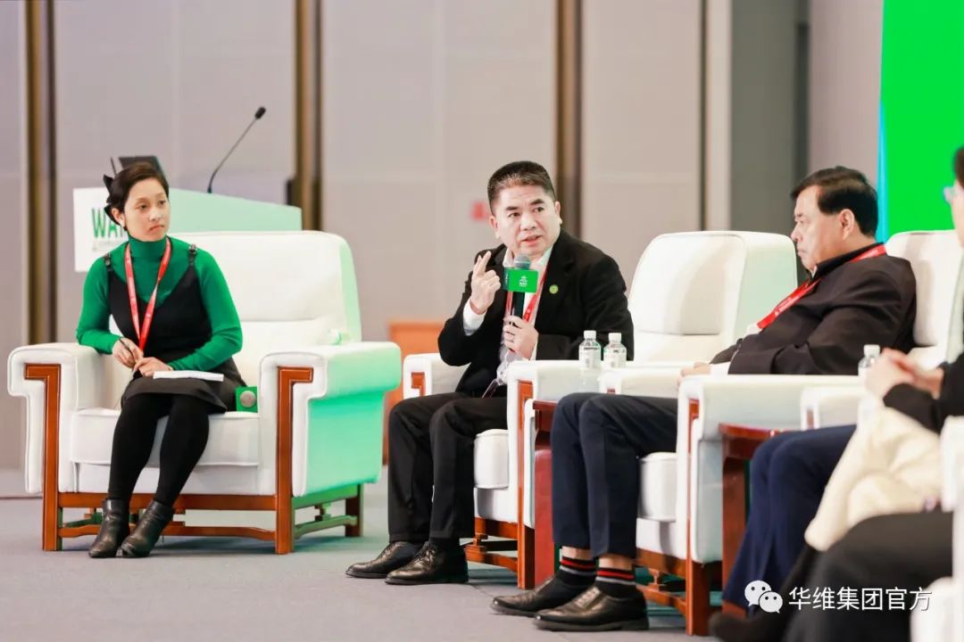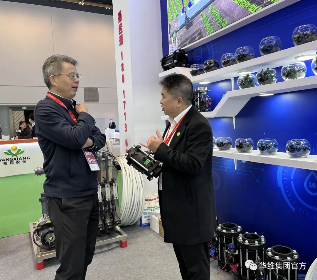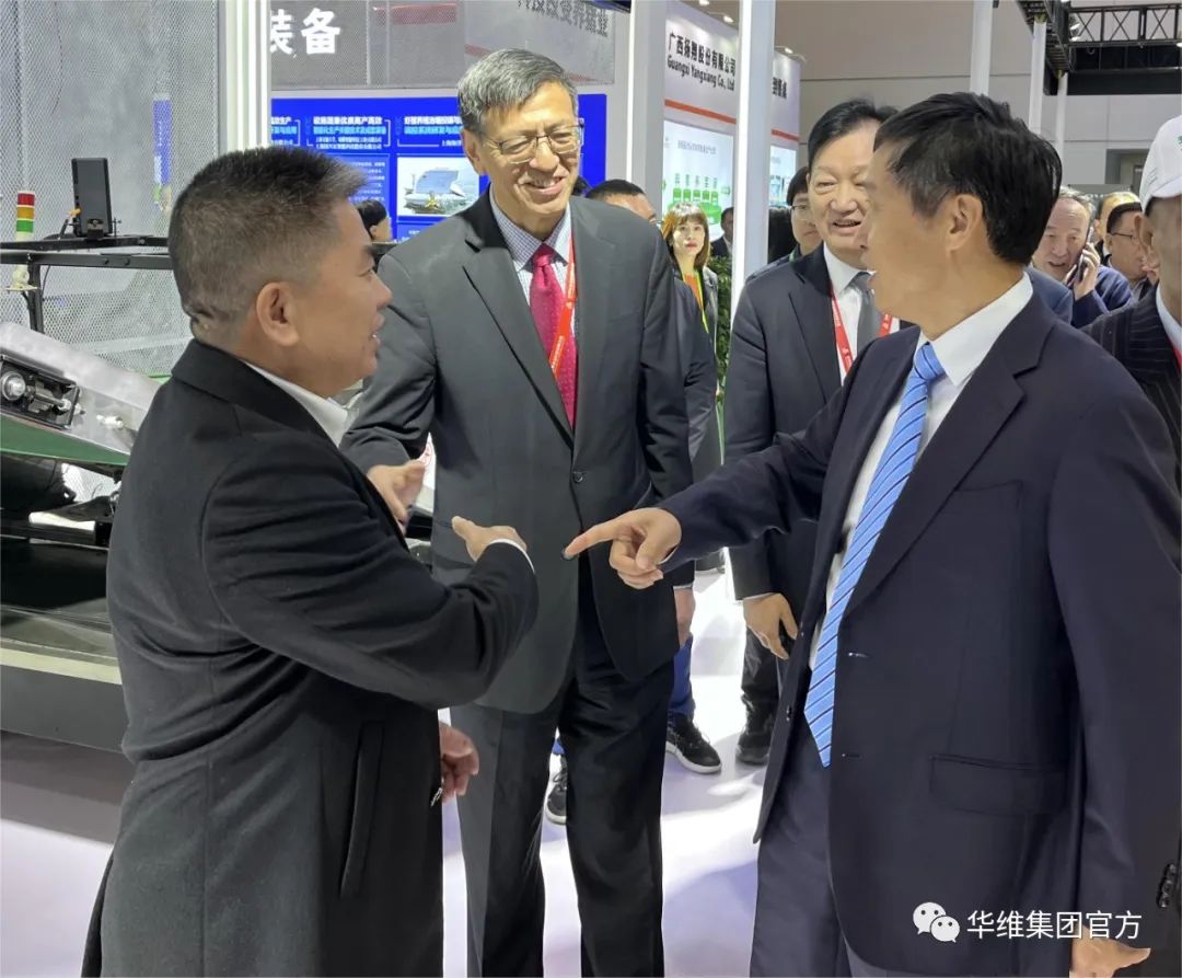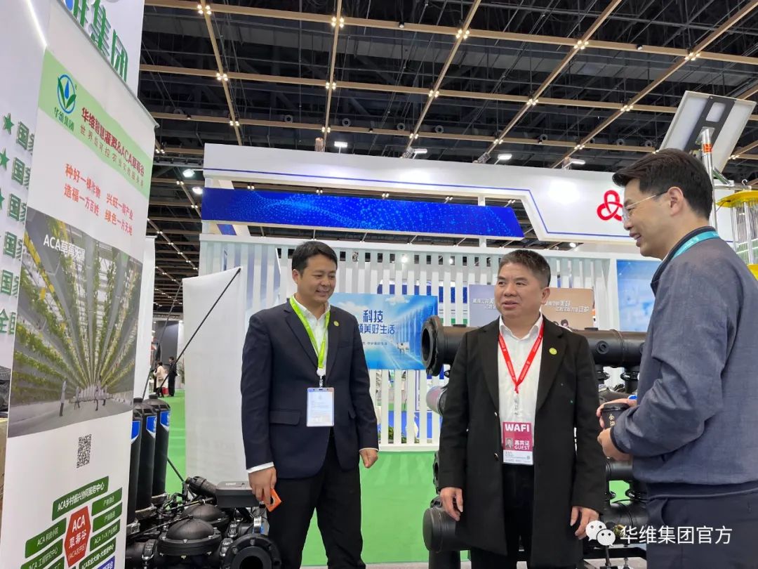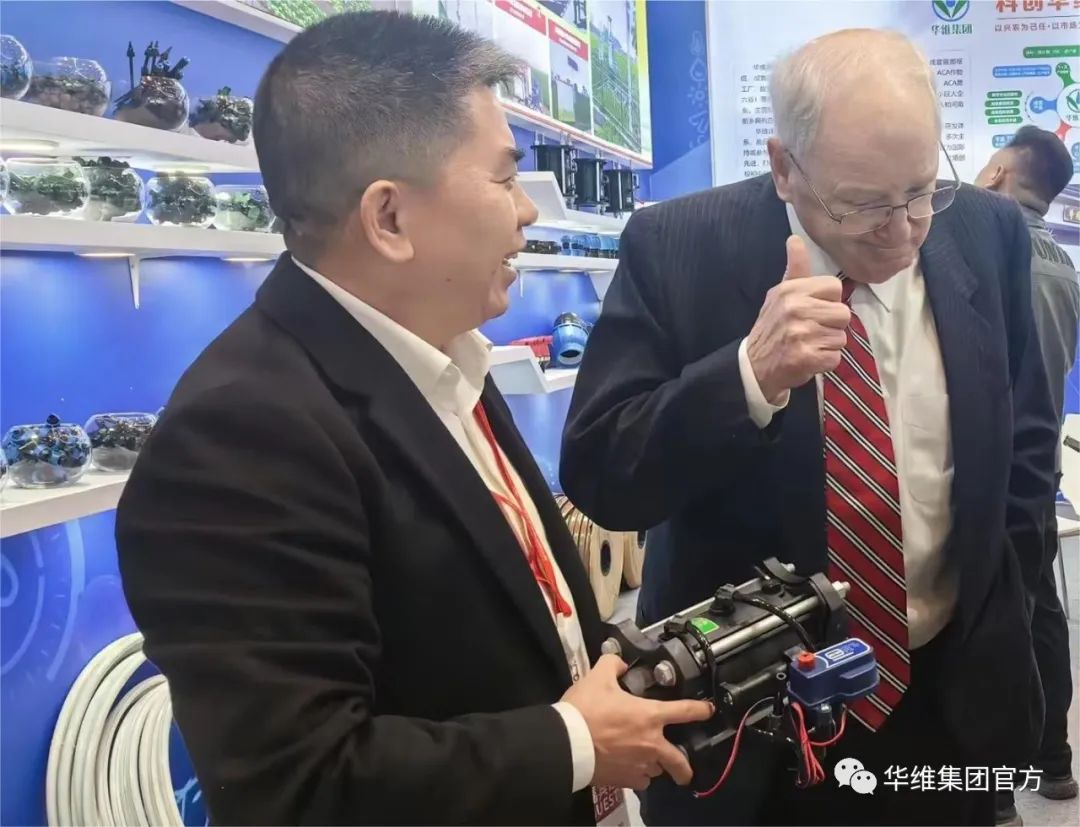 中國(guó)農(nóng)業(yè)大學(xué)黨委書記鐘登華院士(右一)向嘉賓介紹華維集團(tuán)