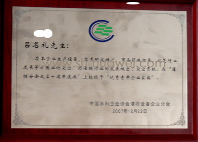 會(huì)上由業(yè)界專家給一直以來(lái)特別支持灌排行業(yè)和灌排分會(huì)發(fā)展的政府官員頒發(fā)了特別榮譽(yù)獎(jiǎng),由部委領(lǐng)導(dǎo)給在灌排行業(yè)企業(yè)生產(chǎn)經(jīng)營(yíng)、技術(shù)研發(fā)推廣、商務(wù)領(lǐng)域拓展、規(guī)范行業(yè)發(fā)展等方面成績(jī)卓著的企業(yè)家,以及立志于灌排行業(yè)、年輕有為、有創(chuàng)業(yè)精神、業(yè)績(jī)突出的青年企業(yè)家,分別頒發(fā)了杰出貢獻(xiàn)獎(jiǎng)和優(yōu)秀青年企業(yè)家獎(jiǎng)。華維公司總經(jīng)理呂名禮等五人獲得了優(yōu)秀青年企業(yè)家獎(jiǎng)。