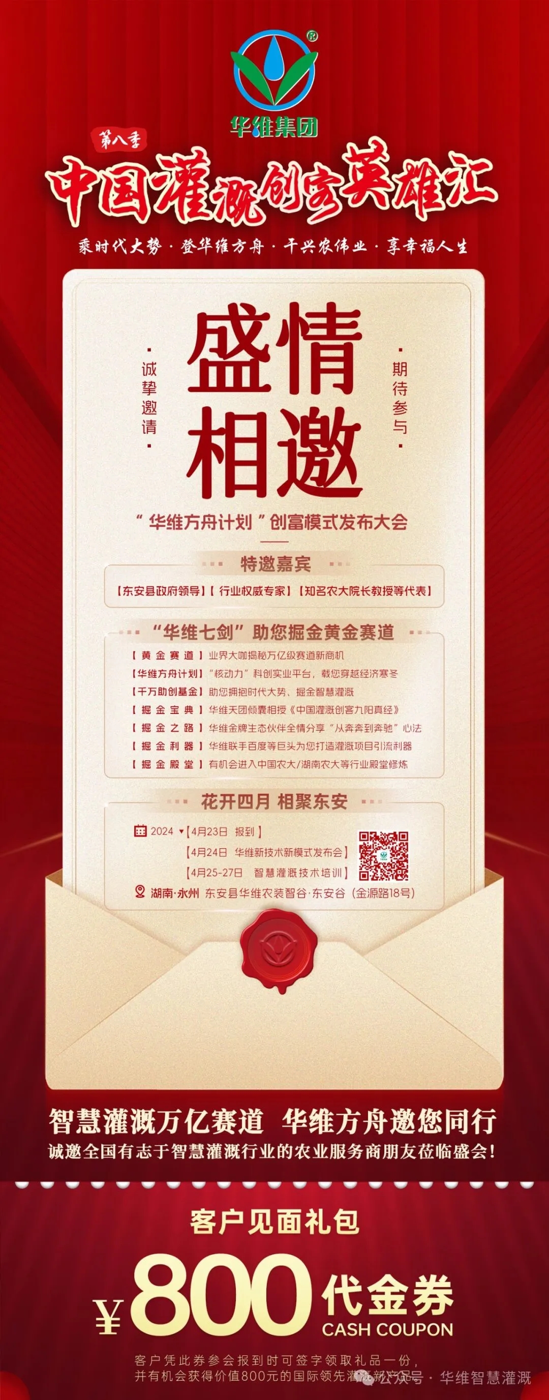 中國灌溉創(chuàng)客英雄匯第八季暨華維“方舟計劃”創(chuàng)富模式發(fā)布大會將于2024年4月24日于華維智谷·東安谷(湖南永州-東安)舉行。
