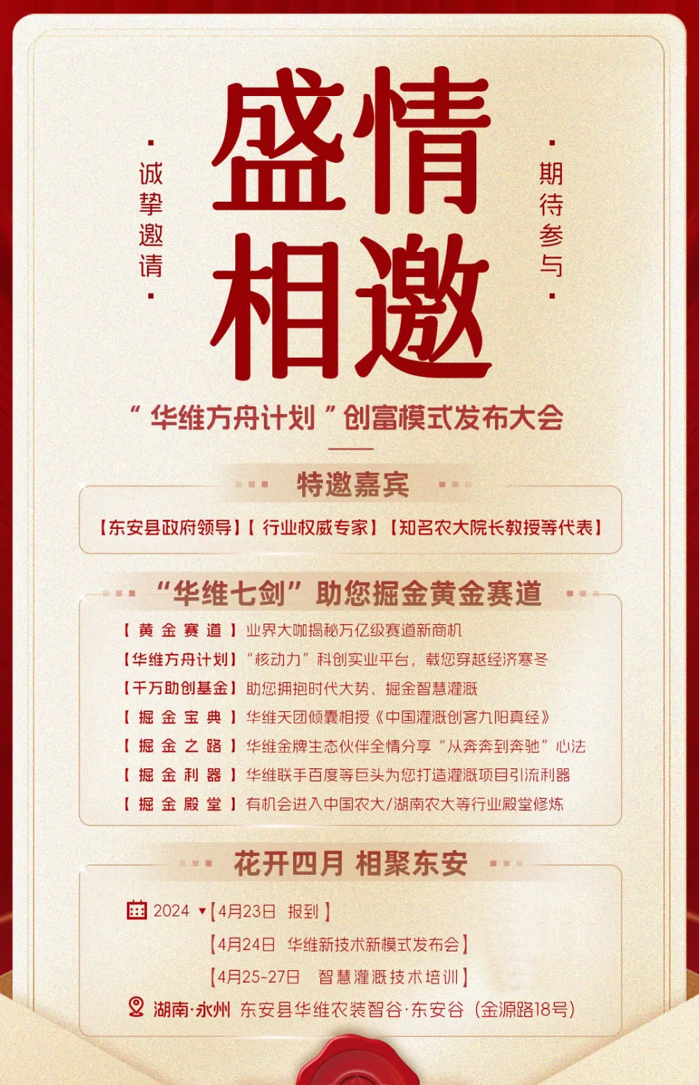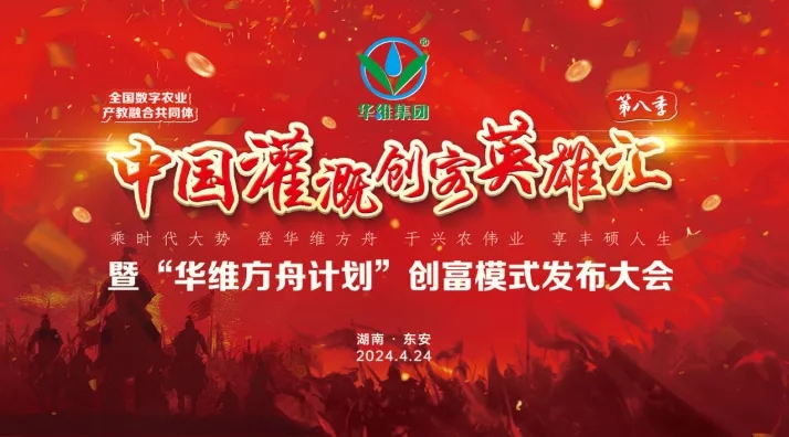 4月24日,灌溉興農(nóng) 千萬助創(chuàng)——全國數(shù)字農(nóng)業(yè)產(chǎn)教融合共同體·第八季中國灌溉創(chuàng)客英雄匯暨華維“方舟計劃”創(chuàng)富模式發(fā)布大會將在華維農(nóng)裝智谷·東安谷(湖南東安縣)隆重召開,花開四月,相聚東安!全新灌溉賽道,全新華維模式,我們熱忱歡迎全國客商走進華維,偕手共創(chuàng)智慧灌溉千萬夢想。