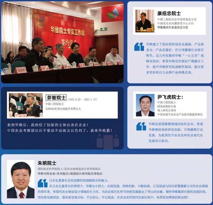 華維建有院士專家工作站、上海節(jié)水灌溉工程技術(shù)研究中心(省部級)、國家節(jié)水灌溉北京工程技術(shù)研究中心聯(lián)合研發(fā)中心等,以中國工程院康紹忠院士為首的專家顧問委員會把脈華維技術(shù)研發(fā)。設(shè)立華維研究院(農(nóng)業(yè)裝備研究所、數(shù)字農(nóng)業(yè)研究所、規(guī)劃設(shè)計研究院、華維農(nóng)科所),結(jié)合實踐不斷創(chuàng)新引領(lǐng)行業(yè)技術(shù)發(fā)展,多類產(chǎn)品經(jīng)院士專家鑒定為國際先進、打破國外“卡脖子”技術(shù)壟斷、實現(xiàn)進口替代。多次主持或參與國家863課題、國家重點研發(fā)計劃等,制定國家標準,先后榮獲國家科技進步二等獎、國家級“專精特新”小巨人企業(yè)等榮譽。