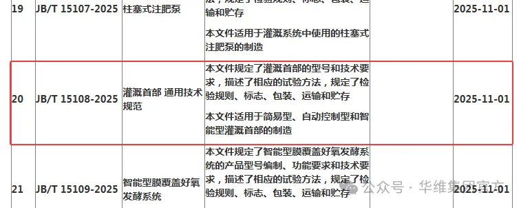 近日,工業(yè)和信息化部公告,批準(zhǔn)了1128項行業(yè)標(biāo)準(zhǔn),其中全國農(nóng)機標(biāo)委會歸口的農(nóng)機行業(yè)標(biāo)準(zhǔn)31項,華維集團參編的《灌溉首部 通用技術(shù)規(guī)范》獲批發(fā)布,將于2025年11月實施。