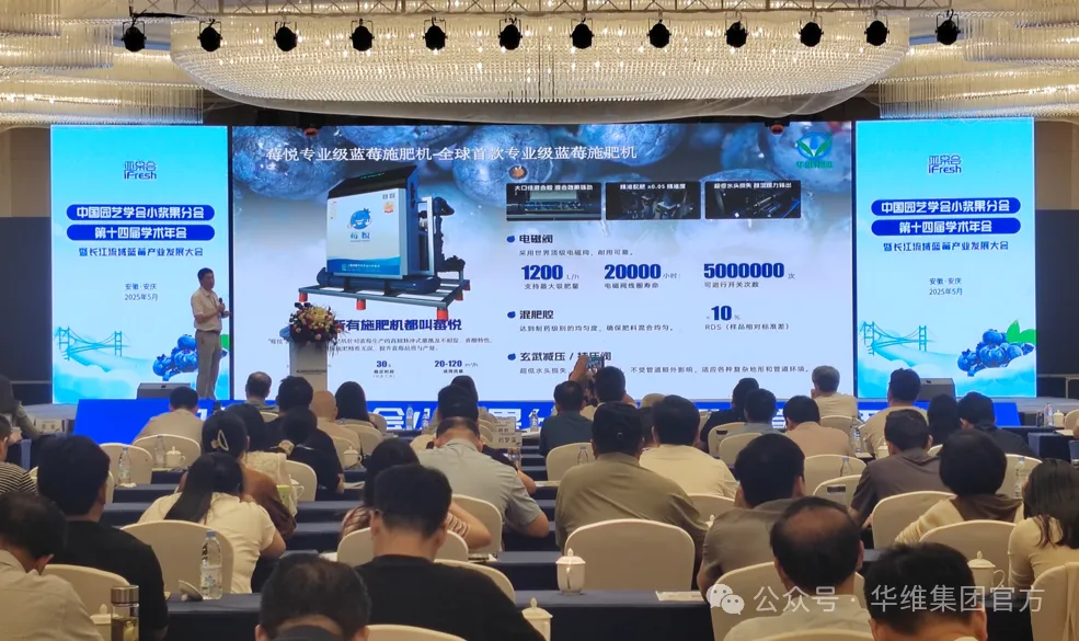 下午,中國園藝學(xué)會小漿果分會第十四屆學(xué)術(shù)年會暨長江流域藍(lán)莓產(chǎn)業(yè)發(fā)展大會隆重召開,懷寧縣委副書記,政府黨組書記、縣長陳宏出席大會并致辭。中國農(nóng)業(yè)科學(xué)院、四川省農(nóng)業(yè)科學(xué)院、江蘇省農(nóng)業(yè)科學(xué)院、中國園藝學(xué)會、中國農(nóng)業(yè)技術(shù)推廣協(xié)會、安徽農(nóng)業(yè)大學(xué)、吉林大學(xué)等科研院所專家,藍(lán)莓產(chǎn)業(yè)鏈企業(yè)(華維集團(tuán)等)代表等圍繞藍(lán)莓種植主體降低成本、產(chǎn)業(yè)高質(zhì)量發(fā)展建言獻(xiàn)策。同期,懷寧藍(lán)莓物資大市場盛大開市。華維展示藍(lán)莓水肥一體化產(chǎn)品,呂名禮董事長(左一)為安慶市委副書記廖強(qiáng)(右二),懷寧縣委副書記、縣長陳宏(右一)等介紹產(chǎn)品技術(shù)華維集團(tuán)受邀做主旨報告,分享基質(zhì)藍(lán)莓一站式解決方案,從微觀破局、宏觀謀篇,闡述ACA可控農(nóng)業(yè)模式助力藍(lán)莓產(chǎn)業(yè)發(fā)展。早在2022年,華維智慧灌溉便已服務(wù)著懷寧縣的萬畝藍(lán)莓基地。此次華維不僅介紹了基于ACA第六谷·藍(lán)莓谷模式的藍(lán)莓基地從建園到管理的一站式服務(wù),而且著重分享了對藍(lán)莓種植貢獻(xiàn)度超過70%(華南農(nóng)業(yè)大學(xué)陳日遠(yuǎn)教授研究結(jié)論)的智慧水肥一體化系統(tǒng)。對于當(dāng)下懷寧縣藍(lán)莓的露天栽培模式而言,智慧灌溉無疑是升級模式、升級產(chǎn)業(yè)的核心選擇。近年來,華維智慧灌溉和可控農(nóng)業(yè)持續(xù)助力中國藍(lán)莓產(chǎn)業(yè)發(fā)展。自2023年,華維已為光筑農(nóng)業(yè)60多個藍(lán)莓基地提供智慧灌溉系統(tǒng)服務(wù)。莓悅專業(yè)級藍(lán)莓施肥機(jī)、成套灌溉設(shè)備等贏得了客戶的認(rèn)可,極大降低了藍(lán)莓項目的綜合成本,解決了眾多疲于東拼西湊的藍(lán)莓巨頭和工程服務(wù)商們“不會買、不敢買”的顧慮,實現(xiàn)進(jìn)口替代!