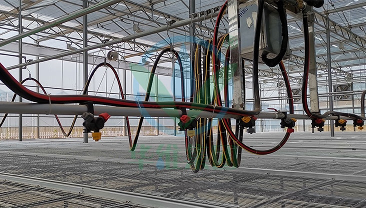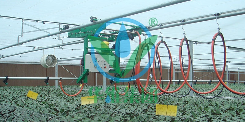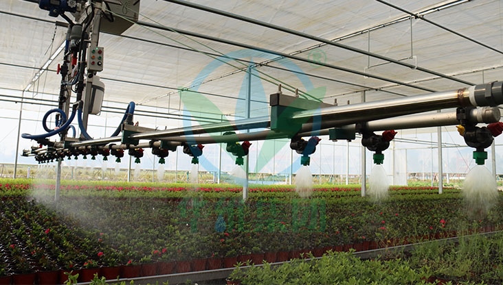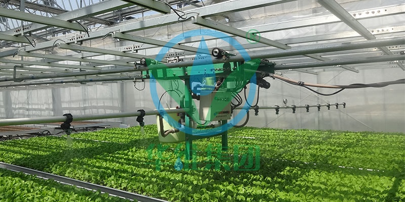 噴灌機(jī)在懸掛于溫室頂部的軌道上運(yùn)行,進(jìn)行灌溉作業(yè),以減少對(duì)溫室其他作業(yè)的影響;同時(shí)噴灌機(jī)可從一組運(yùn)行軌道輕松轉(zhuǎn)移到另一組運(yùn)行軌道,利用一臺(tái)噴灌機(jī)可實(shí)現(xiàn)多跨溫室不同區(qū)域的灌溉,可大大降低設(shè)備投資。