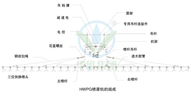掃碼查看視頻 懸掛式自走噴灌機(jī),專(zhuān)為溫室噴灌設(shè)計(jì),有垂管供水(端部供水)方式和平管(中間供水)供水方式。